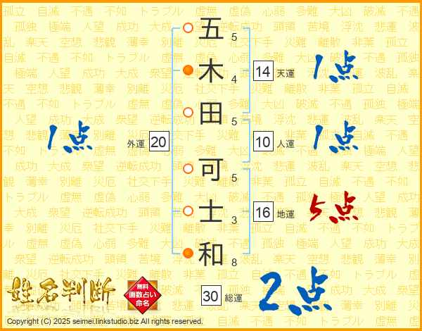 生活面を象徴する運勢です。外部から受ける影響力を表し、結婚運、家庭運や職場、環境への順応性を表します。総運から人運を引いた画数。姓や名が1文字の場合を除く。
