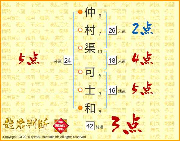 仲(6画)村(7画)渠(13画) 可(5画)士(3画)和(8画)