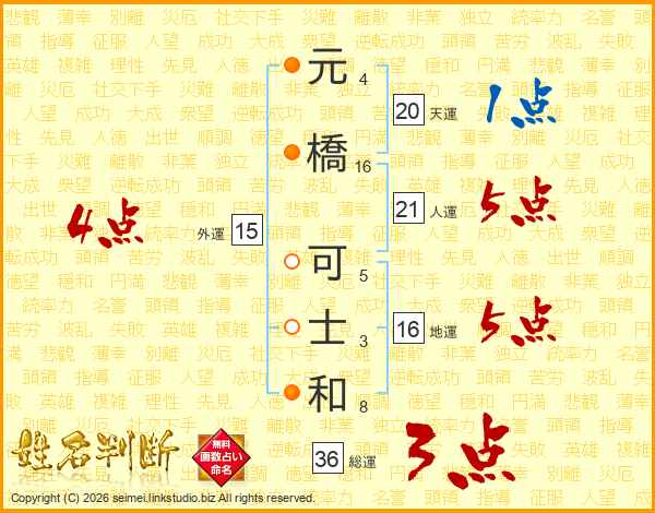 元(4画)橋(16画) 可(5画)士(3画)和(8画)