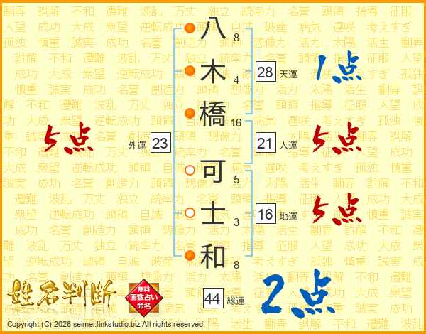 八(8画)木(4画)橋(16画) 可(5画)士(3画)和(8画)
