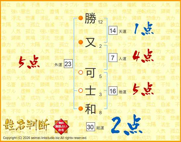 勝(12画)又(2画) 可(5画)士(3画)和(8画)