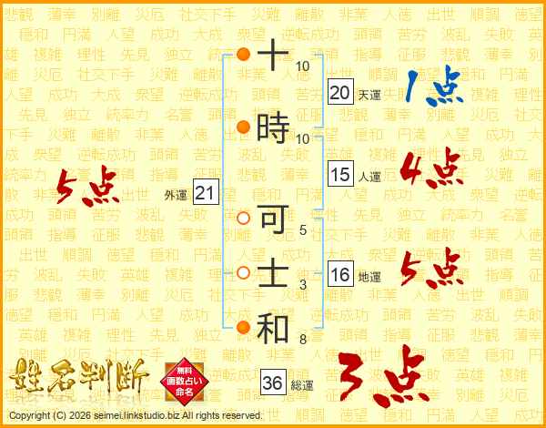 十(10画)時(10画) 可(5画)士(3画)和(8画)