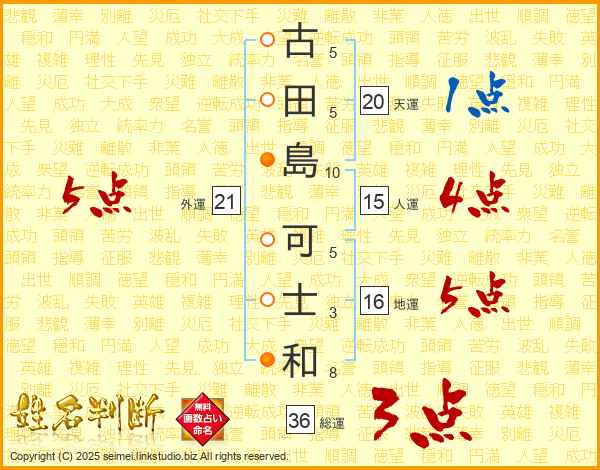 古(5画)田(5画)島(10画) 可(5画)士(3画)和(8画)