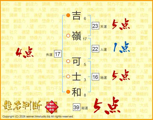 吉(6画)嶺(17画) 可(5画)士(3画)和(8画)