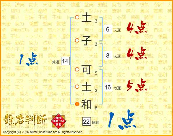 土(3画)子(3画) 可(5画)士(3画)和(8画)