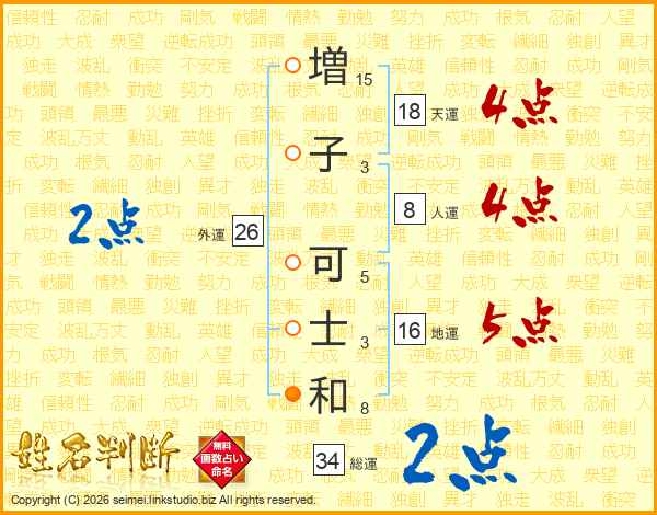 増(15画)子(3画) 可(5画)士(3画)和(8画)