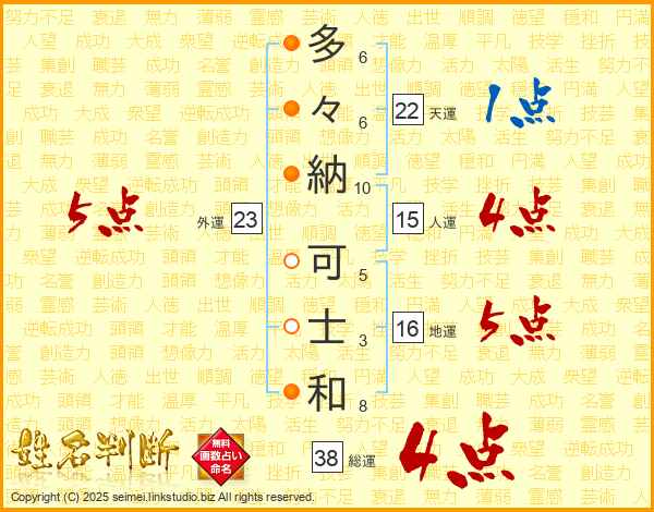 生活面を象徴する運勢です。外部から受ける影響力を表し、結婚運、家庭運や職場、環境への順応性を表します。総運から人運を引いた画数。姓や名が1文字の場合を除く。