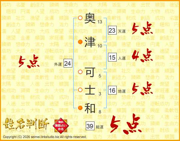 奥(13画)津(10画) 可(5画)士(3画)和(8画)