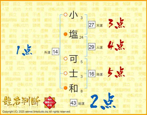小(3画)塩(24画) 可(5画)士(3画)和(8画)