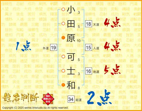 小(3画)田(5画)原(10画) 可(5画)士(3画)和(8画)