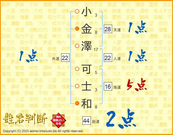 小(3画)金(8画)澤(17画) 可(5画)士(3画)和(8画)