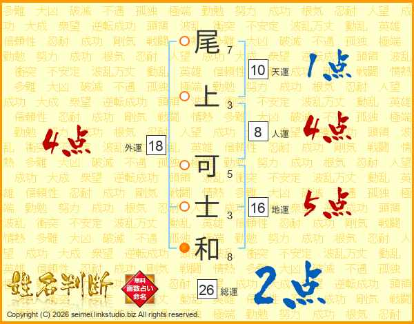 尾(7画)上(3画) 可(5画)士(3画)和(8画)