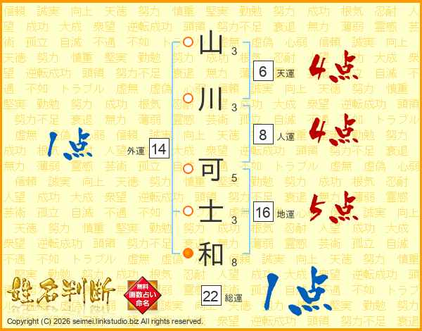 生活面を象徴する運勢です。外部から受ける影響力を表し、結婚運、家庭運や職場、環境への順応性を表します。総運から人運を引いた画数。姓や名が1文字の場合を除く。