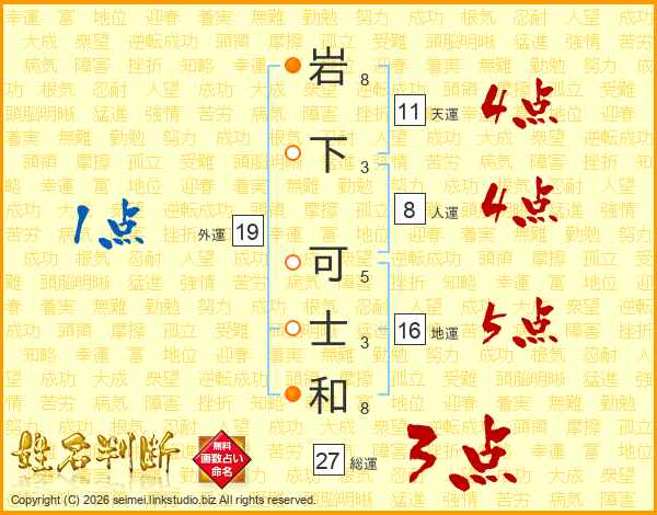 岩(8画)下(3画) 可(5画)士(3画)和(8画)