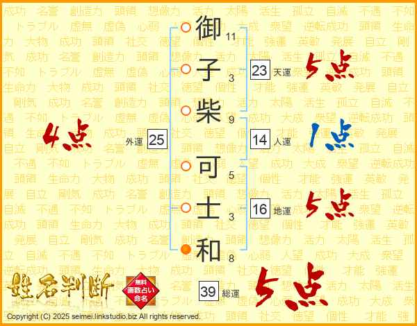 御(11画)子(3画)柴(9画) 可(5画)士(3画)和(8画)