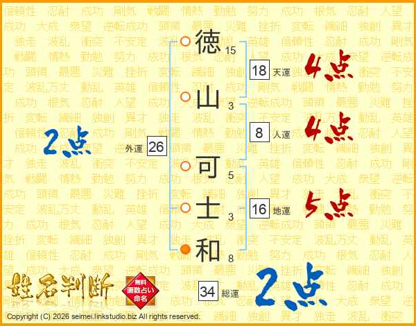 徳(15画)山(3画) 可(5画)士(3画)和(8画)