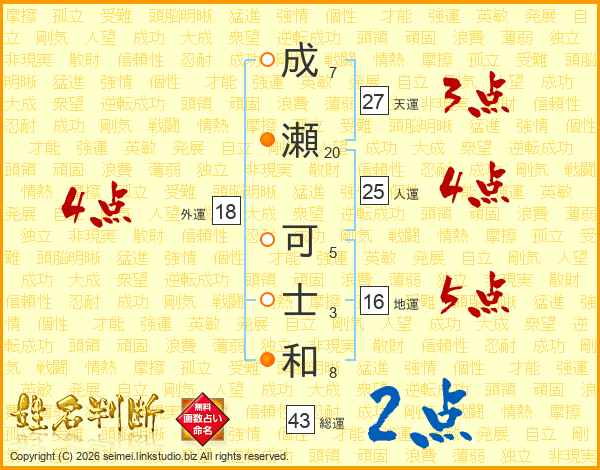 成(7画)瀬(20画) 可(5画)士(3画)和(8画)