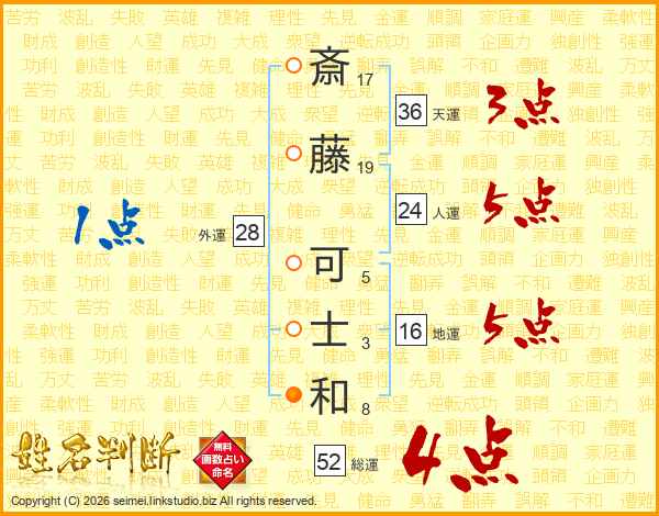 斎(17画)藤(19画) 可(5画)士(3画)和(8画)