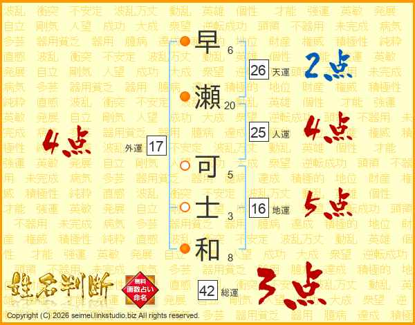 早(6画)瀬(20画) 可(5画)士(3画)和(8画)