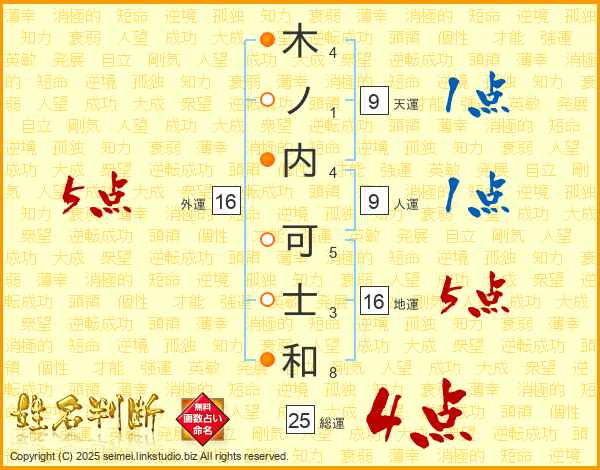 木(4画)ノ(1画)内(4画) 可(5画)士(3画)和(8画)