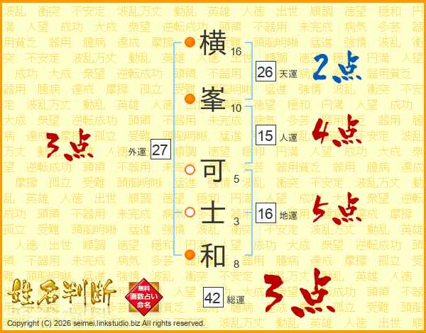 横(16画)峯(10画) 可(5画)士(3画)和(8画)