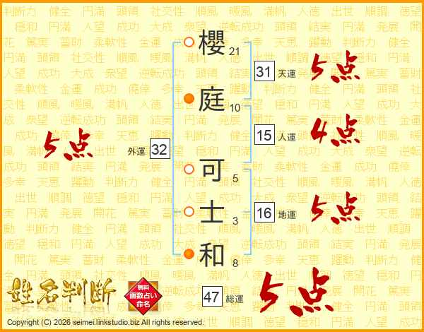 櫻(21画)庭(10画) 可(5画)士(3画)和(8画)