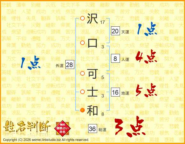 沢(17画)口(3画) 可(5画)士(3画)和(8画)