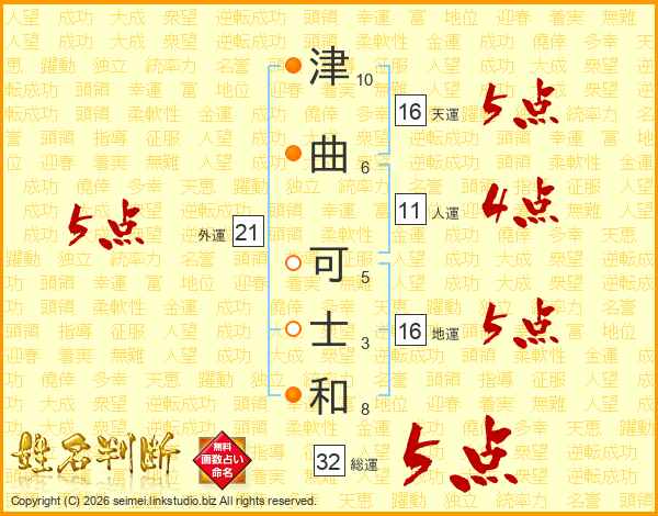 津(10画)曲(6画) 可(5画)士(3画)和(8画)