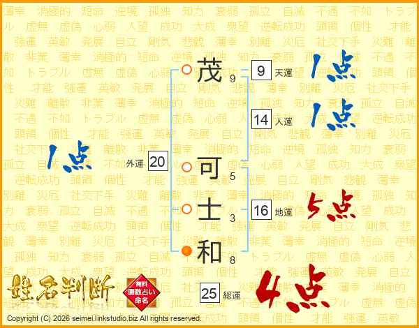 生活面を象徴する運勢です。外部から受ける影響力を表し、結婚運、家庭運や職場、環境への順応性を表します。総運から人運を引いた画数。姓や名が1文字の場合を除く。