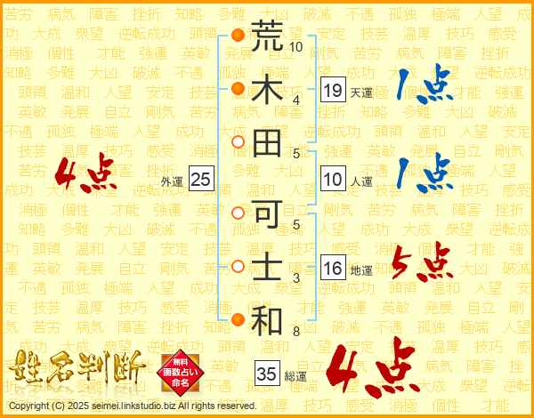荒(10画)木(4画)田(5画) 可(5画)士(3画)和(8画)