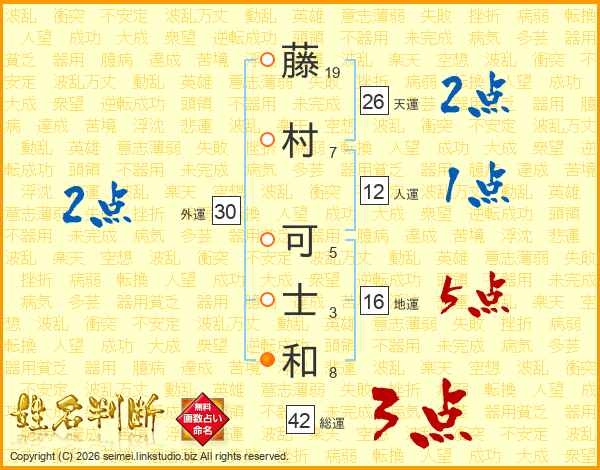 藤(19画)村(7画) 可(5画)士(3画)和(8画)