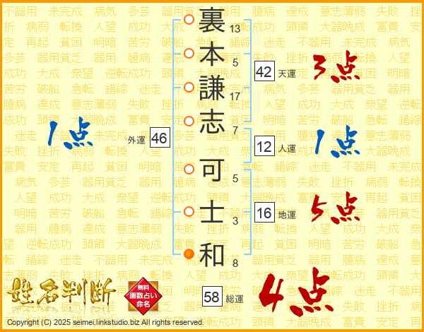 裏(13画)本(5画)謙(17画)志(7画) 可(5画)士(3画)和(8画)