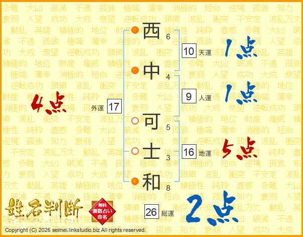 生活面を象徴する運勢です。外部から受ける影響力を表し、結婚運、家庭運や職場、環境への順応性を表します。総運から人運を引いた画数。姓や名が1文字の場合を除く。