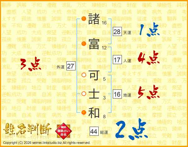 諸(16画)富(12画) 可(5画)士(3画)和(8画)