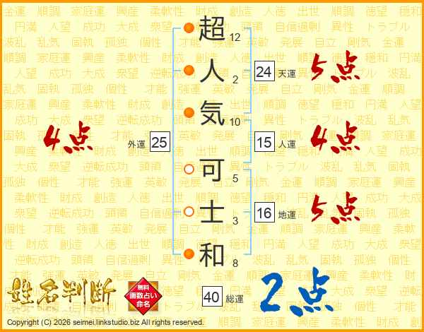 超(12画)人(2画)気(10画) 可(5画)士(3画)和(8画)