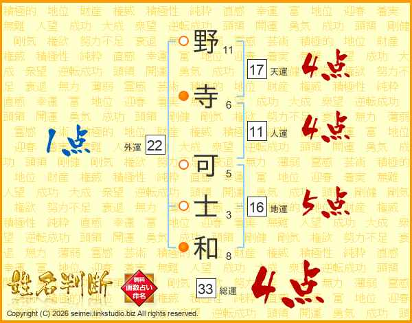 野(11画)寺(6画) 可(5画)士(3画)和(8画)