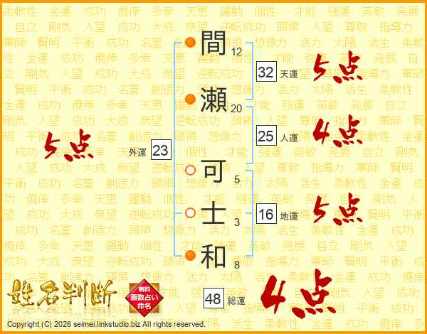 間(12画)瀬(20画) 可(5画)士(3画)和(8画)