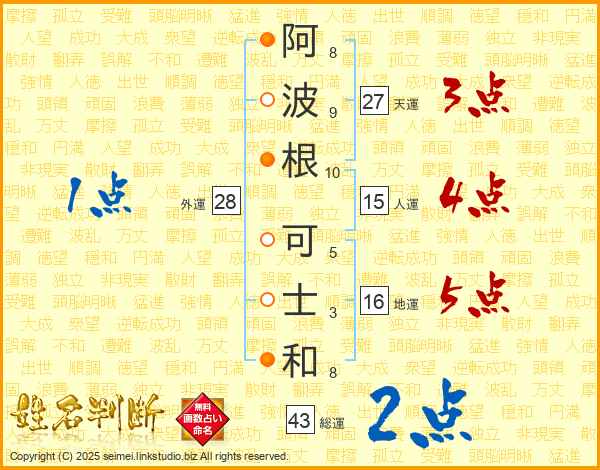 生活面を象徴する運勢です。外部から受ける影響力を表し、結婚運、家庭運や職場、環境への順応性を表します。総運から人運を引いた画数。姓や名が1文字の場合を除く。