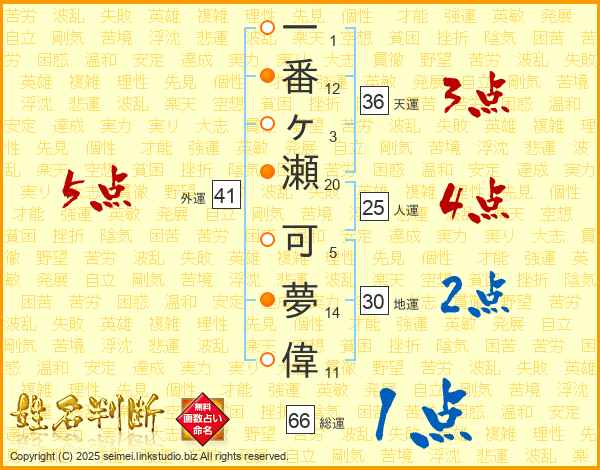 一番ヶ瀬可夢偉さんの総運は66画の1点!