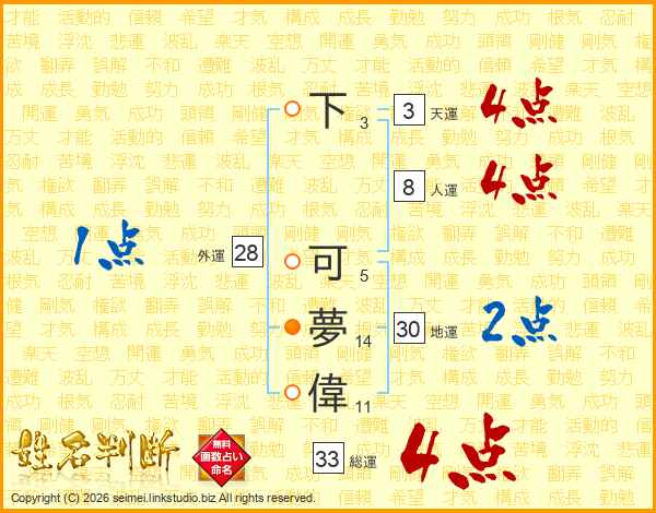 生活面を象徴する運勢です。外部から受ける影響力を表し、結婚運、家庭運や職場、環境への順応性を表します。総運から人運を引いた画数。姓や名が1文字の場合を除く。