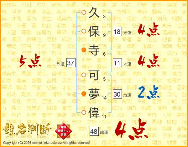 久(3画)保(9画)寺(6画) 可(5画)夢(14画)偉(11画)