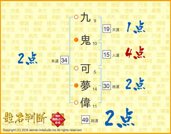 九鬼可夢偉さんの総運は49画の2点!