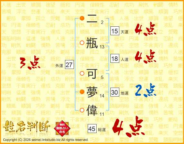 二瓶可夢偉さんの総運は45画の4点!