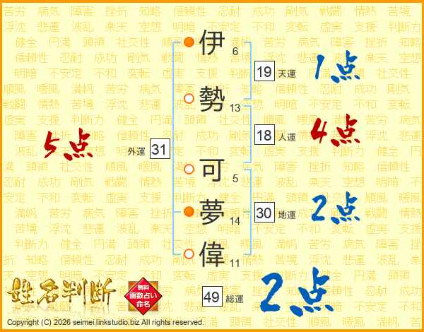 伊勢可夢偉さんの総運は49画の2点!