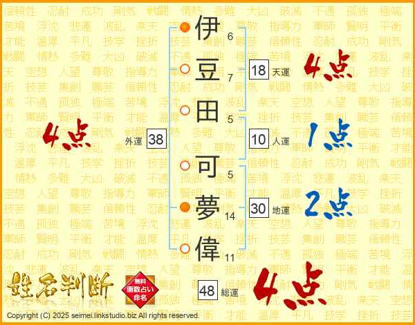 伊(6画)豆(7画)田(5画) 可(5画)夢(14画)偉(11画)