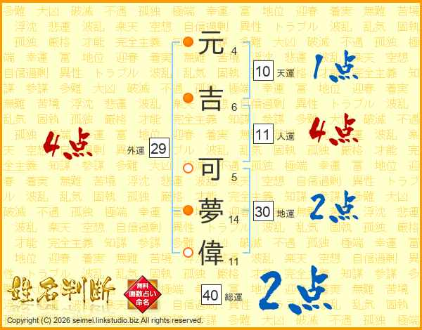 元吉可夢偉さんの総運は40画の2点!