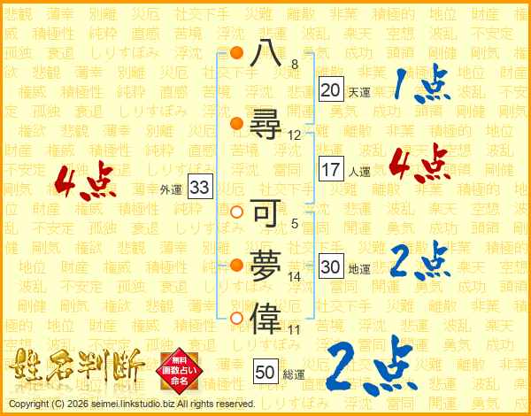 八尋可夢偉さんの外運は33画の4点!