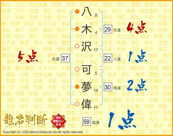 八(8画)木(4画)沢(17画) 可(5画)夢(14画)偉(11画)