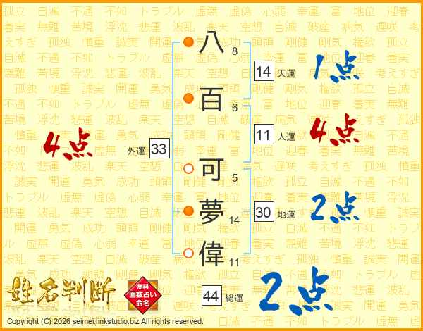 八百可夢偉さんの総運は44画の2点!