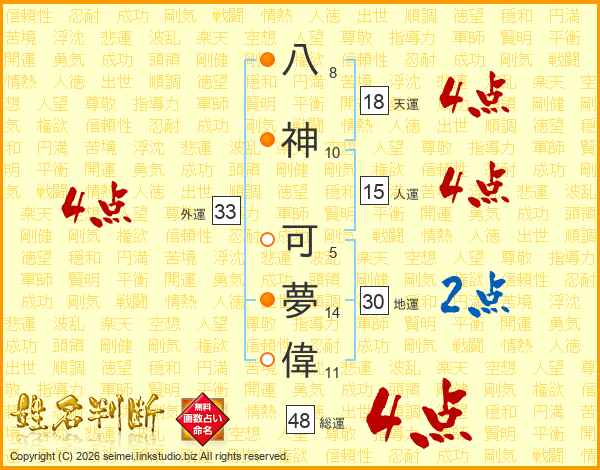八(8画)神(10画) 可(5画)夢(14画)偉(11画)